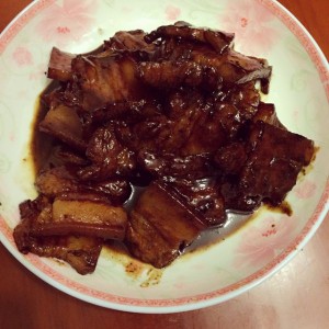 加入油,一勺糖,糖千万别弄太多哦,不然肉会太黑带苦!炒糖,用锅铲将糖和油以打圈圈的方式炒,待油和糖溶解(锅里面开始沸腾,产生棕色液体),倒入腌制好的肉