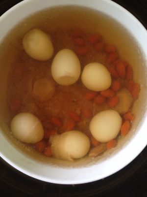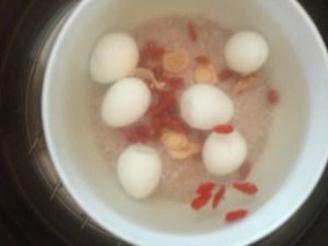 加入鹌鹑蛋,西洋参,枸杞,少许盐,大火蒸25分钟(只要学会前面几步,这里可以按自己的喜好放入配料,如:生地麦冬肉饼汤也特别好喝)