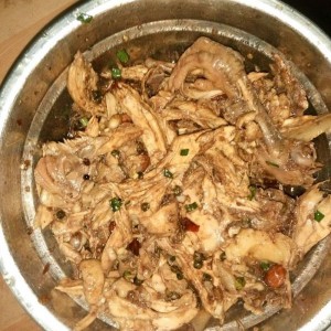 一个小时左右就差不多了,捞出来凉一会儿,带上一次性手套把鸡整理出来,撕成小块,(小块是为了比较容易进味)调料依个人爱好吧!就这样手撕鸡就出来咯。。。