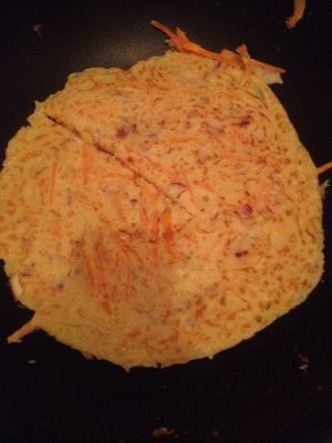 平底锅放适量的油,把搅拌好的面粉倒进去,底面煎得金黄即可反面