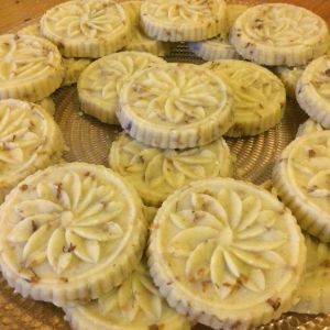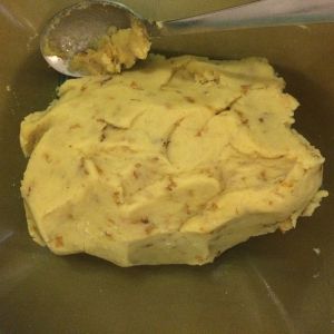 锅里放入橄榄油黄油融化后倒入绿豆泥。待油和绿豆泥混合加入桂花和蜂蜜适当地加入白砂糖。之后全部融合在一起弄匀取出。