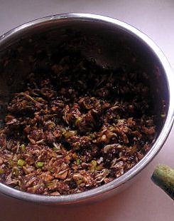 包包子前把萝卜馅儿和猪肉馅儿混合调匀。
