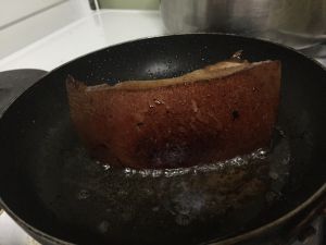 肉块每一面都炸一下,肉皮炸到蜷缩,有点糊就可以起锅了。