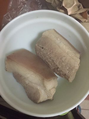 挑选半肥半瘦的猪肉,放入开水中煮10分钟左右,水中加点老姜提鲜。