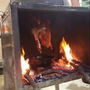 挂起来吹干,为节省时间,用风扇吹。身干了可以放烧鹅炉烧了,东莞大岭山人家家有一炉的。40分钟就0k了,荔枝柴味道好一点。