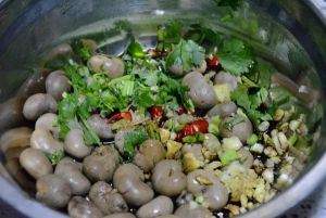 兔腰洗干净,撕掉上面那层薄膜,用料酒,盐,白胡椒粉先腌制一下,葱姜蒜和小米辣切末,香菜切段。