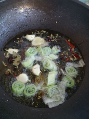 锅里的油凉后放入所有的调料小火慢慢的炸至葱有一点胡捞出所有的调料放盐,口味自己定吧
