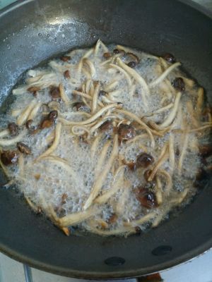 锅里放漫过茶树菇的油大火烧至六七成热放入茶树菇炸至金黄,捞出控油。