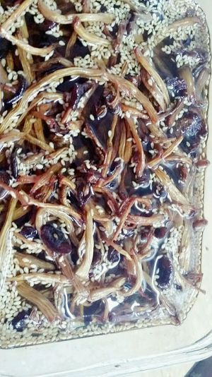 将炸好的油倒入炸好的茶树菇撒上一点熟芝麻,不喜欢可以不放,放入密封的容器进冰箱四个小时以上就可以享用了,建议这个冷藏的过程最好不要省略因为这时才是味道置换的关键时刻,泡的时间越长越好吃,因为油很大所以保质期也会很长的放个几周慢慢吃绝对没有问题,不过要吃多少取多少不要让口水进入哦