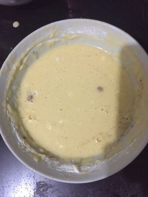 调面糊。我用了2个鸡蛋,水。面粉比淀粉多一些,调成糊状,不用特别稠。里面放一些盐,胡椒粉,为了更有味。