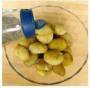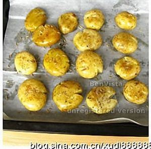 将土豆排入烤盘上,撒上香草碎。入预热后的烤箱200度烤制30分钟,中间翻面一次即可。