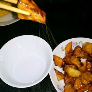 炒糖时小火,冒泡后迅速关火把地瓜倒入搅拌,最后盛在摸了一层熟油的盘子里,准备一碗凉水,开吃
