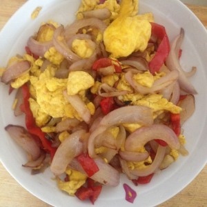 把鸡蛋盛起来,然后加点油爆炒红辣椒和洋葱