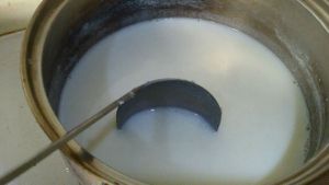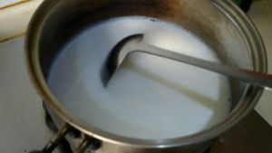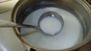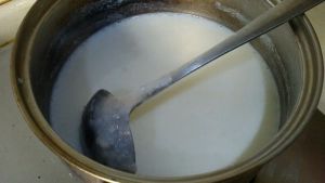 倒入奶粉,不停地搅拌,以免结块。(但搅拌速度也不宜过快,以免溅出锅外)