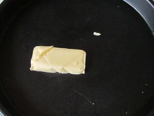 取出一小块黄油,将它均匀的涂抹在披萨盘的底部和四周;