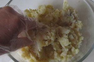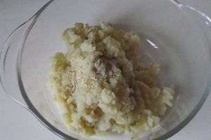 煮熟的土豆碾成泥, 在其中加入适量的盐, 胡椒等调味料;
