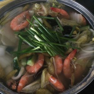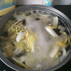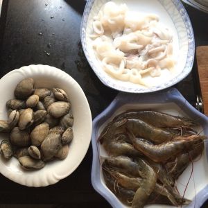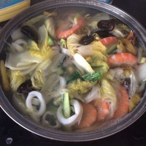 先加入花蛤煮至花蛤开口后放入虾煮至虾变红后放入鱿鱼和木耳黄瓜同煮,加入2勺盐再煮一会儿