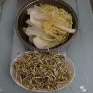 烧一锅开水,放入泡椒,姜片煮2分钟,再加入黄豆芽,娃娃菜煮约十分钟