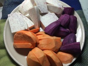 将切好块的三种材料放入电饭锅中蒸熟,一定要严格分开哦,不然颜色会串的