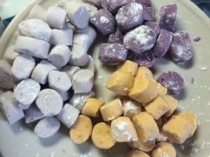 蒸好以后取三个碗分别放紫薯、红薯、香芋,用手或者勺子将它们捏成泥,一定要全部变成泥,将木薯粉和三种泥按1:1混合,像和面一样和好,软度以能成形,不散掉为宜。如果想吃弹一点的建议可以增加木薯粉的用量,觉得硬的话,可以加一点椰浆。然后将面团搓成直径2-3cm的长条,用刀切成小块,生的芋圆就做好啦~
