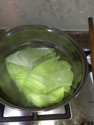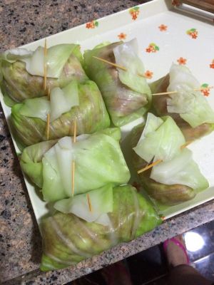 用高丽菜叶包好肉馅儿,用牙签扎好