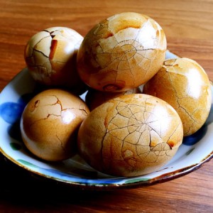 鸡蛋煮熟挨个敲出裂痕,加入卤料包、水煮开,加入老抽、生抽、黄冰糖、茶叶包(红茶)一起小火炖煮2小时,关火浸泡隔夜更加入味。