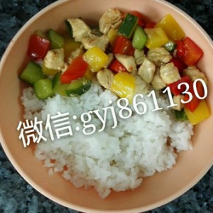 乘碗米饭,浇上五彩鸡丁,就好啦,这么多颜色宝宝肯定爱吃