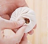 取一个剂子,擀成周围薄,中间稍厚的面皮,盛入馅,如图捏拢。