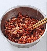 把腌好的肉丁与炒好的切丁拌在一起,根据自己口味再烹入适量盐和香油即制成馅。