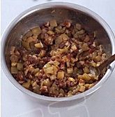 茄子去皮切丁,锅里热油,加姜片,八角,桂皮炝锅,捞出不要,放入葱碎爆香,倒入茄丁,小火翻炒至茄子变软,盛出晾凉备用。