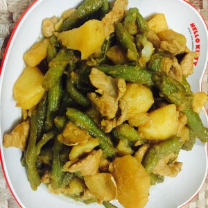 菜洗干净,豆角掰成段,土豆切块,肉切片