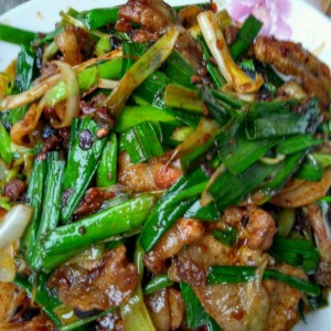 准备的食材有半肥瘦的猪肉.蒜苗。