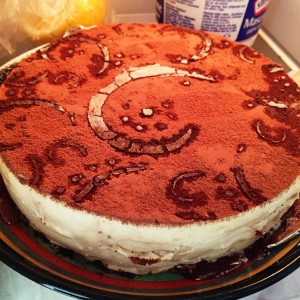再倒入剩余的奶油奶酪糊。放入冰箱冷藏两小时以上可以拿出来装饰。一般先在表面撒层可可粉,当然也可以充分发挥自己的想象力