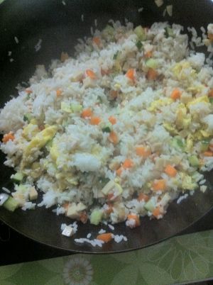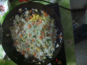 翻炒后倒上米饭,加点水,剩饭都有点干