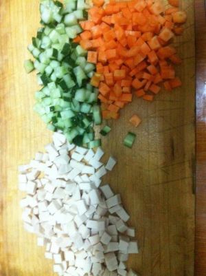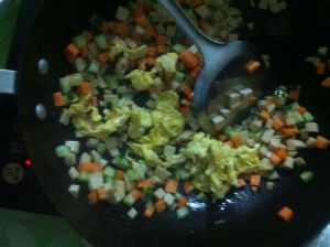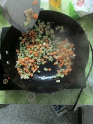 翻炒一会倒黄瓜丁和胡萝卜丁