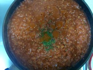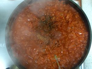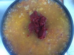 番茄炒成泥后加入牛肉清汤和番茄酱罐头盖盖焖至粘稠。(当中需要翻几次以免粘锅。)