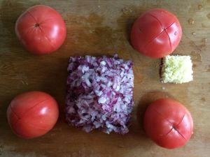 烧锅热水,同时大蒜切末,洋葱切细碎的小丁,番茄上划十字刀。