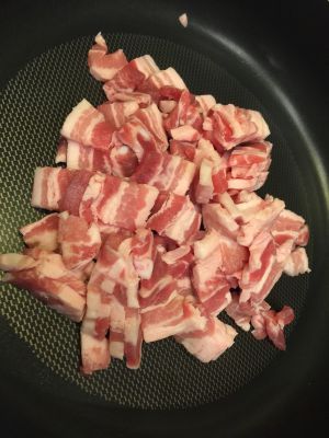 锅子烧热,不需加油,直接放入切片的韩式五花肉。