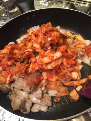 加入切好的泡菜,大火炒至泡菜温热。
