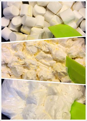 加入棉花糖,迅速翻炒,直到棉花糖完全融化成一大朵沉甸甸的棉花云。记得一定样保持小小火哦,否则糖容易炒糊!