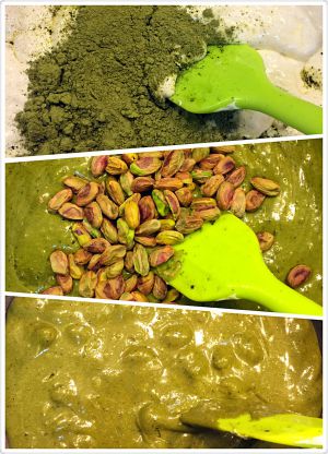 坚果类最后加,比如这款抹茶开心果哒,就在奶粉后,先加入抹茶粉,小火炒匀,再加入开心果,迅速炒匀。