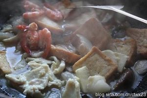 加入煸好的鸡肉片和熟鲜虾,煮开一分钟