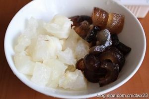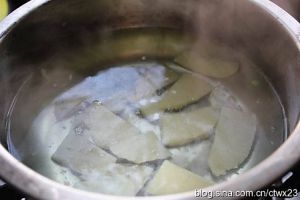 蹄筋洗净轻轻捏干,切小块。海参肚子剪开,除掉里面的泥沙和薄衣,切小块待用