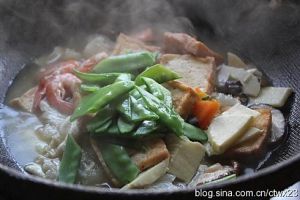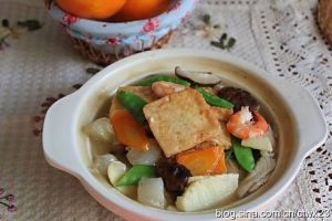 原料:卤水豆腐一盒鲜香菇五个冬笋半支蹄筋四五支 海参二支荷兰豆少许 熟鲜虾八个 鸡脯肉1/3块 胡萝卜半支