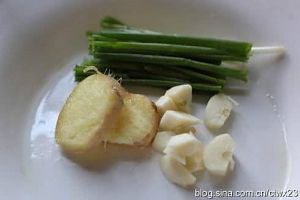 葱洗净摘成葱段,姜切片,蒜去皮拍松切大末