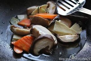 入香菇片、胡萝卜煸炒,淋一点点料酒