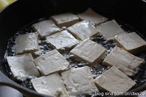 待油温升至七八成热,入豆腐块煎(手在油锅上感觉有些发烫的时候)