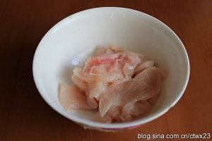 鸡脯肉洗一下,切薄片,放入少许盐、淀粉、少量水拌匀腌一下