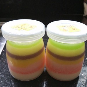 把QQ糖放碗里隔水加热融化,一种颜色差不多放十颗。然后加入一口量的牛奶,均匀搅拌,倒入布丁杯。