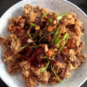 炸好后摆盘,可以随个人口味放上青椒丝 胡萝卜丝 香菜等(本人今天放的青椒丝)